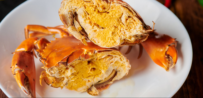 指膏蟹的卵沒有完全化油的蟹,有油底,同時具備膏蟹的膏,但比普通膏蟹更加順滑細(xì)膩,行內(nèi)稱為二手黃油蟹,品質(zhì)較高,吃起來軟糯甘香。